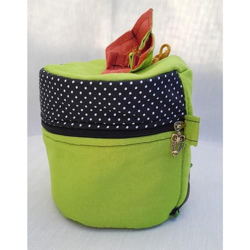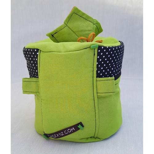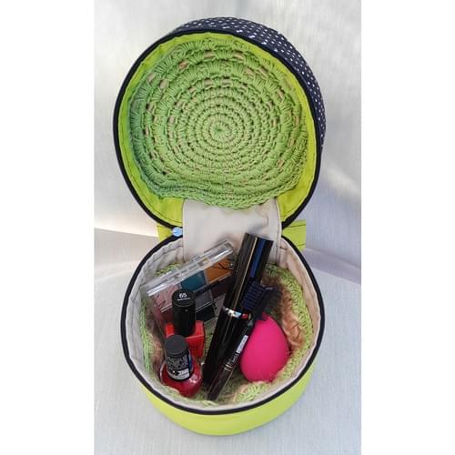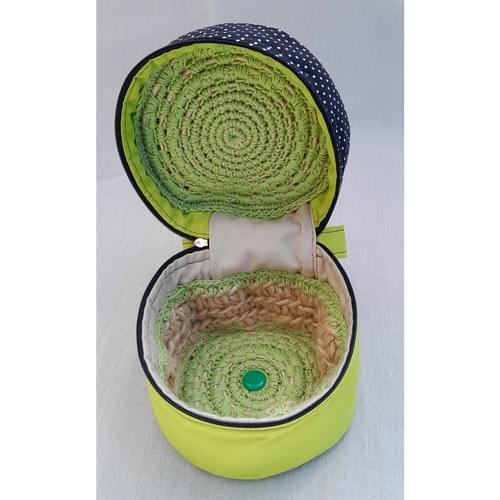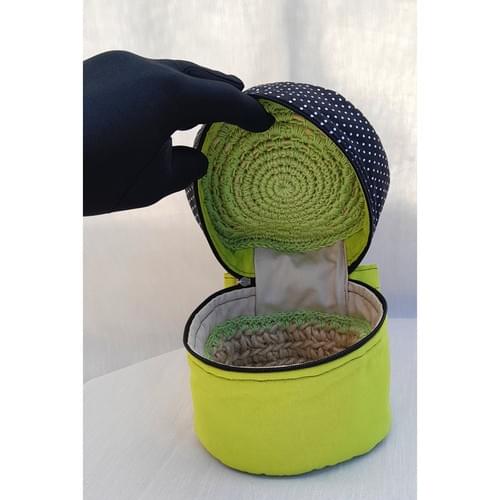 La doublure, quant à elle, est réalisée avec de la cordelette en jute et du fil de coton vert anis.