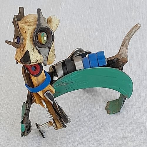 Les assemblages ont été faits par soudure à l'arc pour le métal et par collage pour les autres matériaux. Un travail minutieux qui m'a demandé beaucoup de concentration et d'heures de réalisation... Et cela sans parler du plaisir d'avoir réussi " Mon chien fait son cirque " !